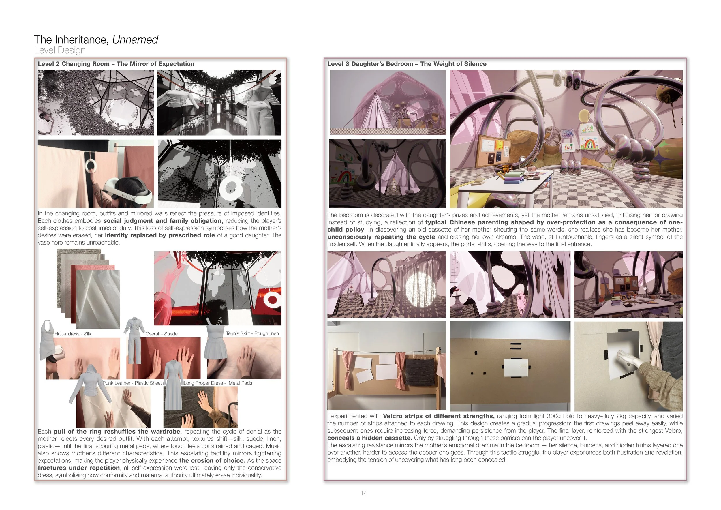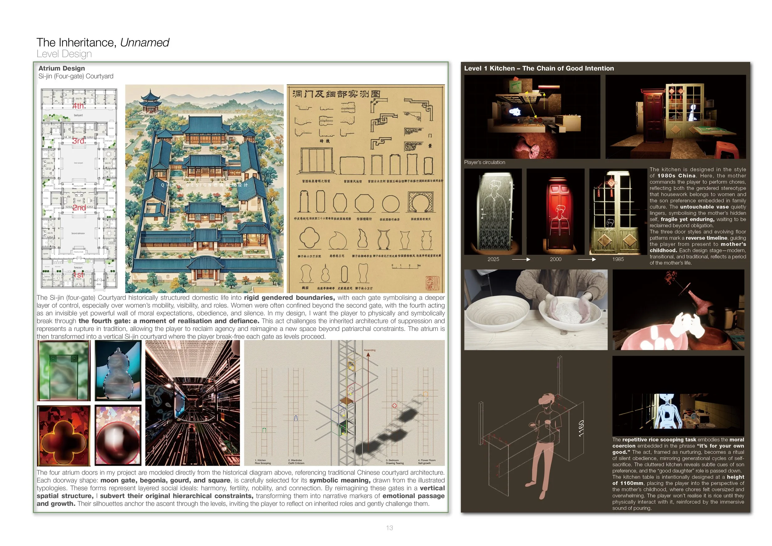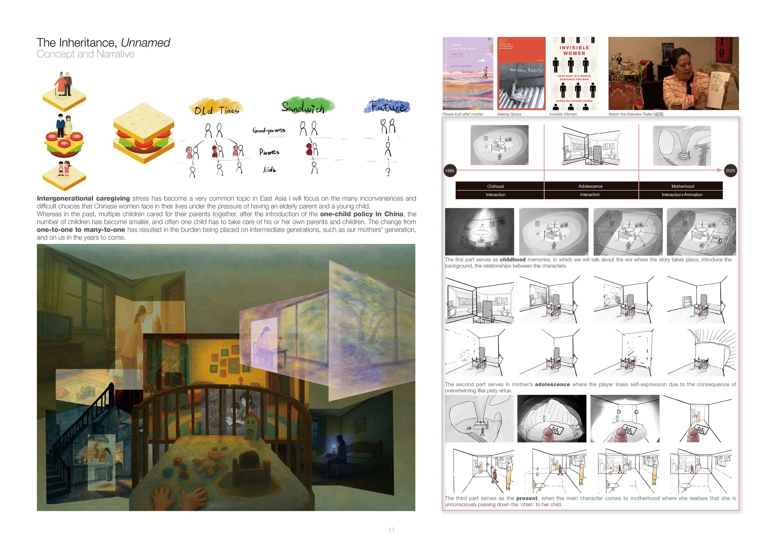 The narrative unfolds across four interactive rooms, each representing a stage of inherited expectation from childhood to adulthood. In the kitchen, the rice jar symbolises guilt-tripping disguised as love, where the stereotype that housework belongs to women intertwines with son preference, turning chores into a chain of duty “for your own good.” In the changing room, mirrored reflections shift with each outfit, illustrating how social and familial judgments restrict self-expression. In the daughter’s bedroom, the player confronts her child’s drawings, discovering that the painful silencing once endured has been repeated and passed down. The final space, a return to the childhood home, becomes a moment of release: past burdens are acknowledged, but let go, offering the possibility of breaking the cycle. By integrating tactile interaction, the project constructs a space in which memory and present blur together. Rather than prescribing answers, it invites reflection on women’s agency, questioning how traditions, policies, and family structures shape identity. At its heart, the project is an act of reclamation: Before being a daughter, wife or a mother – you are, first and foremost, yourself.
