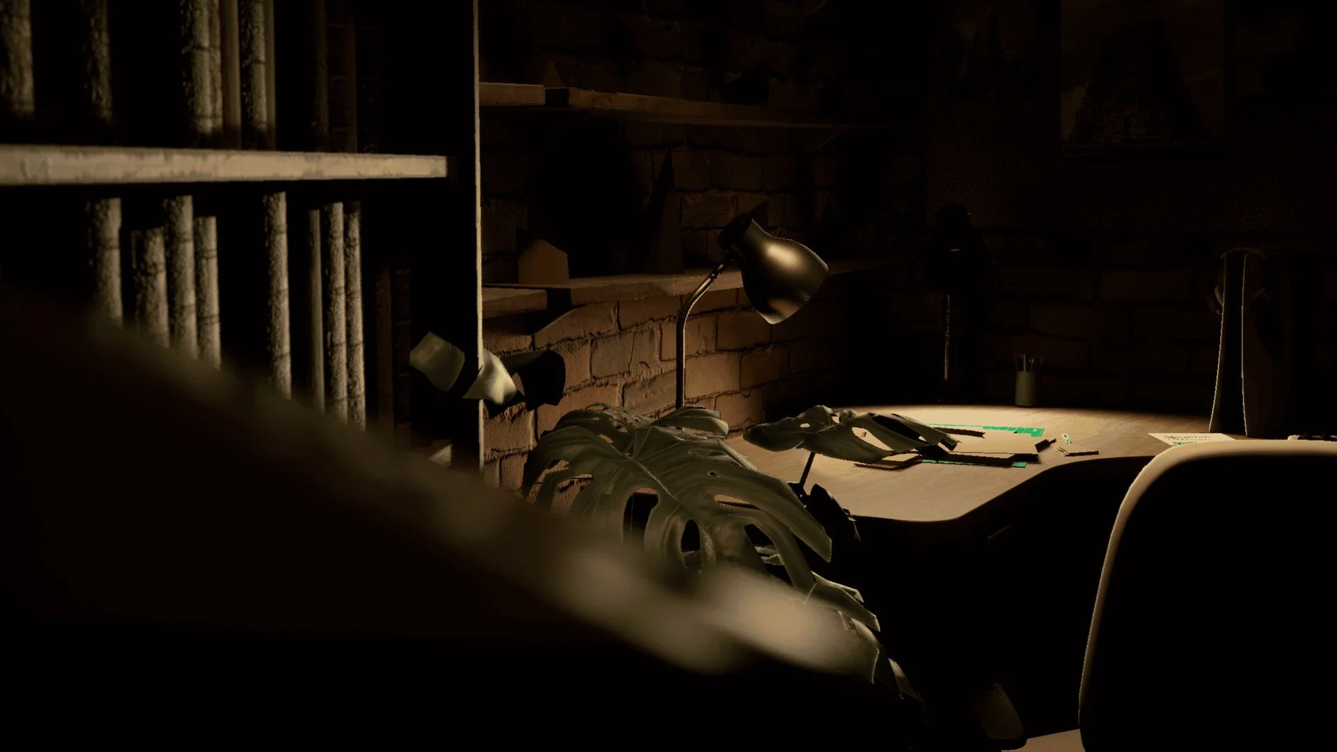 The player shrinks down onto their own desk, entering a surreal world where they can see themselves and the objects around them from a miniature perspective.